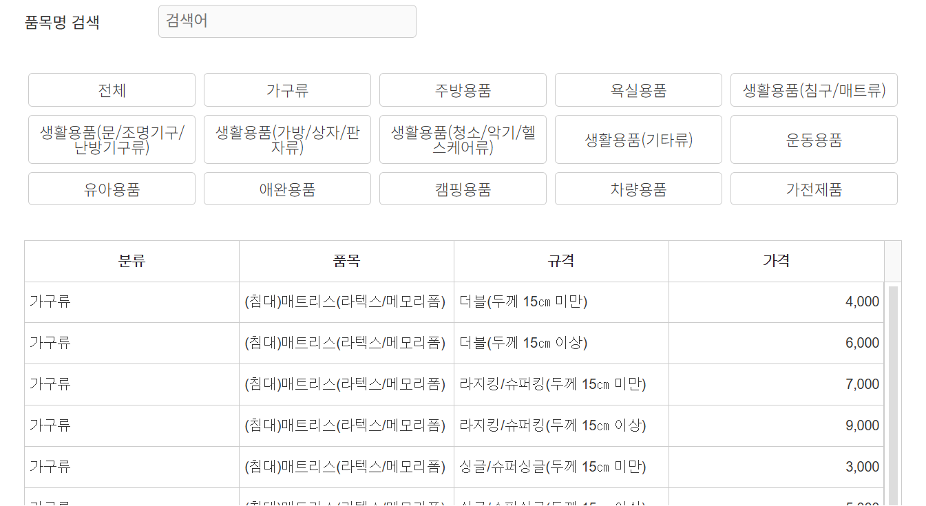 - 침대 매트리스: 크기와 두께에 따라 3,000원부터 9,000원까지 다양합니다.